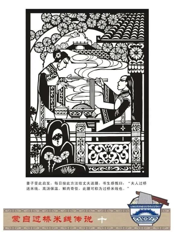 同僚贺喜,其妻如法炮制款待来宾,众人称绝,追问是何佳肴?回想妻子每日辛劳过桥送餐,遂取名过桥米线。此事不胫而走,成一方名膳。