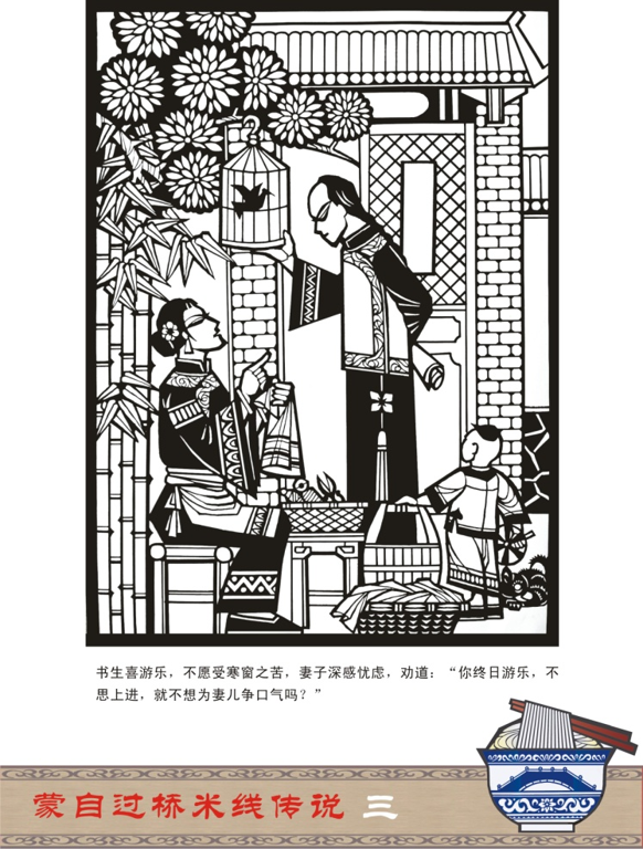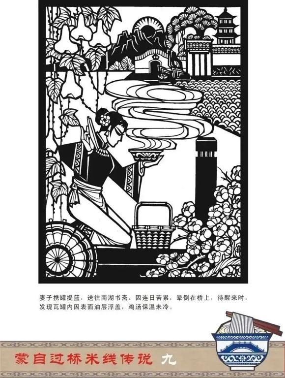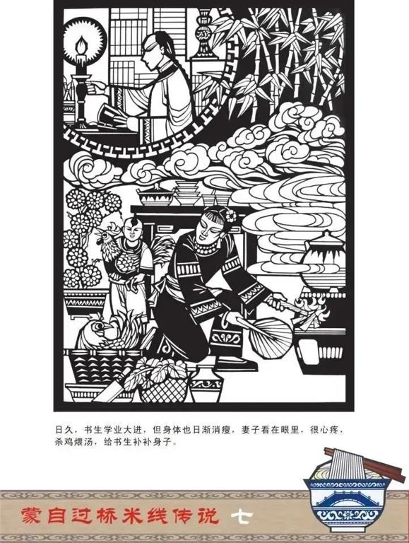 清初某生,蒙邑人,妻某氏,贤且慧,有一子。伉俪情深。生喜游佚,妻忧甚。一日,谓生曰:“好男儿当读书成名,君终日游乐,不思为床头人争气耶!”生感妻言,独居南湖亭中,潜心攻读。逐日三餐,某氏携之生所,聊以生分苦。生深感荷,志益坚,焚膏继晷,学业大进。妻喜,顾生日渐羸弱,凄然,思进补之。一日,备鸡汤,盛之以罐,又备米线、肉片为生作膳,子稚,戏将肉片掷汤中。某氏气极,斥之。忙将肉片捞起,视之已熟,尝之味鲜,大喜。急将米线置篮中,携往生所。因终日忙碌,晕倒湖堤桥上,生至,已醒。幸汤膳勿损,生视之,汤为浮油笼盖,无一丝热气,疑汤已凉;抚罐,罐烫灼掌。奇之,问妻以故,妻详道制作之法。良久,生曰:“此膳可称为过桥米线。”