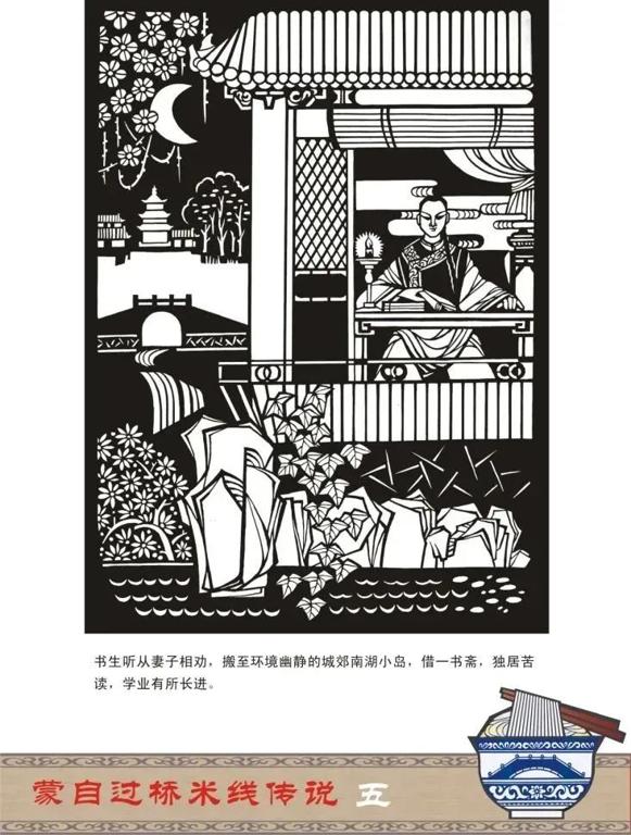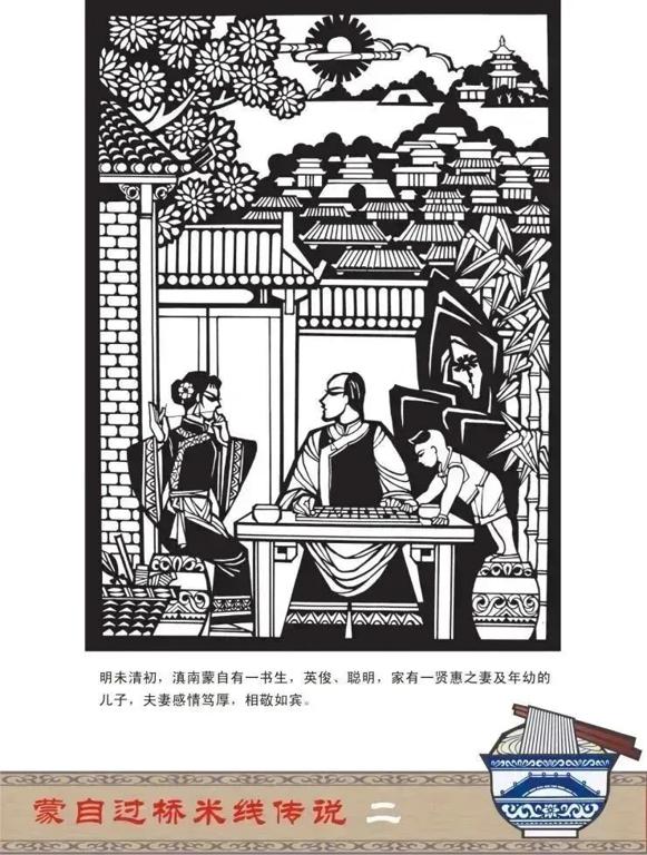 清初某生,蒙邑人,妻某氏,贤且慧,有一子。伉俪情深。生喜游佚,妻忧甚。一日,谓生曰:“好男儿当读书成名,君终日游乐,不思为床头人争气耶!”生感妻言,独居南湖亭中,潜心攻读。逐日三餐,某氏携之生所,聊以生分苦。生深感荷,志益坚,焚膏继晷,学业大进。妻喜,顾生日渐羸弱,凄然,思进补之。一日,备鸡汤,盛之以罐,又备米线、肉片为生作膳,子稚,戏将肉片掷汤中。某氏气极,斥之。忙将肉片捞起,视之已熟,尝之味鲜,大喜。急将米线置篮中,携往生所。因终日忙碌,晕倒湖堤桥上,生至,已醒。幸汤膳勿损,生视之,汤为浮油笼盖,无一丝热气,疑汤已凉;抚罐,罐烫灼掌。奇之,问妻以故,妻详道制作之法。良久,生曰:“此膳可称为过桥米线。”
